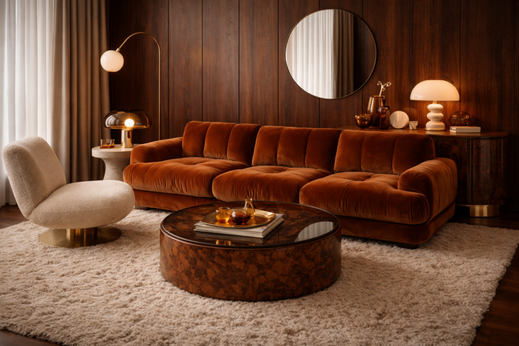 Des formes iconiques, des matières chaleureuses et des teintes profondes pour créer un intérieur de caractère, sans jamais renoncer à l’élégance.