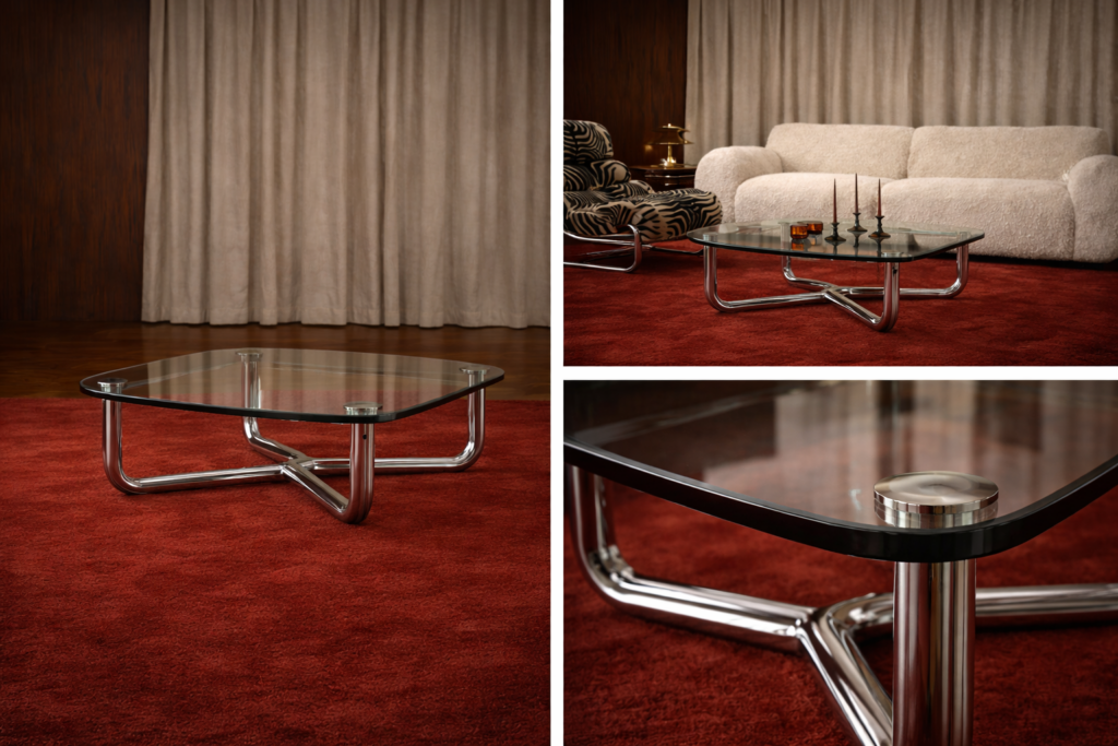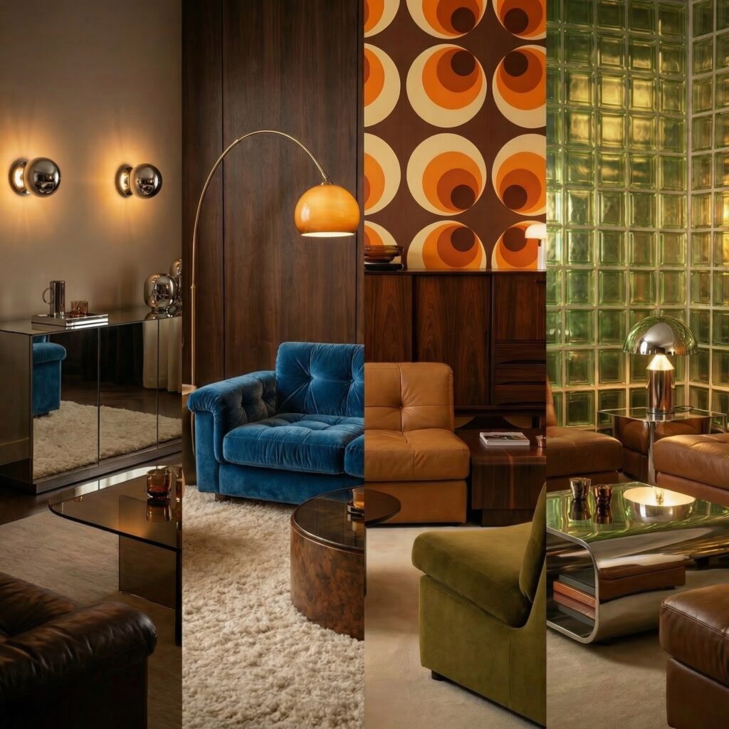 Velours, chrome, verre fumé et teintes chaleureuses s’entrelacent pour recréer l’audace des années 70.