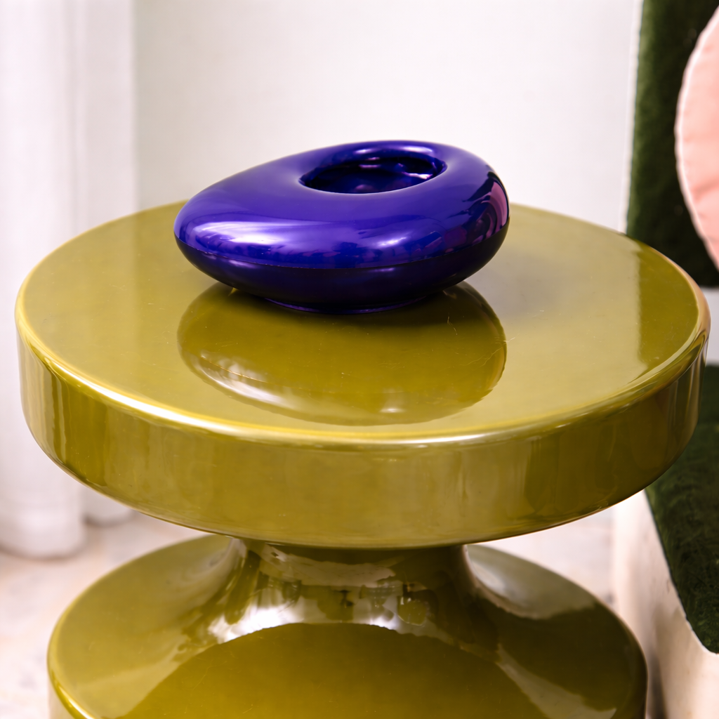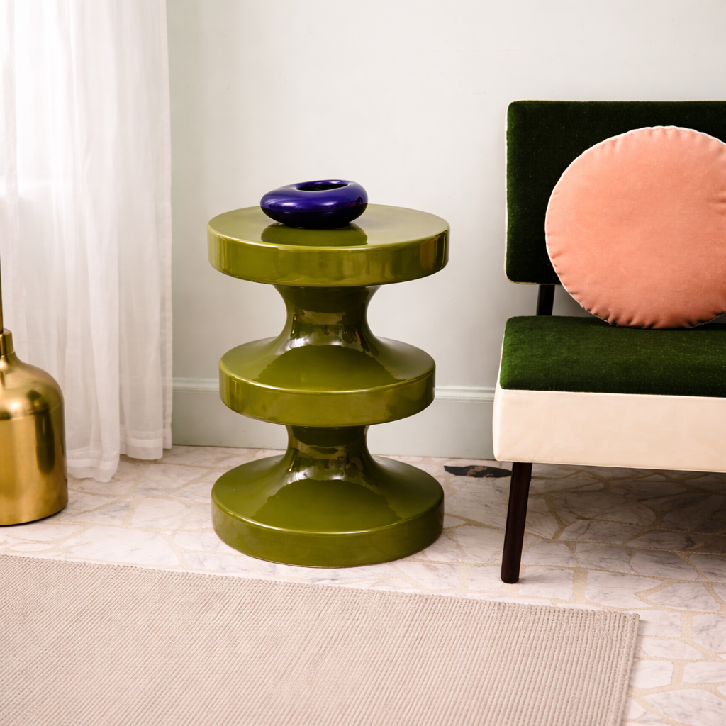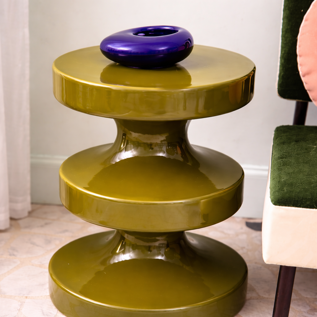 Bout de canapé rond vert olive laqué composé de volumes circulaires empilés.
