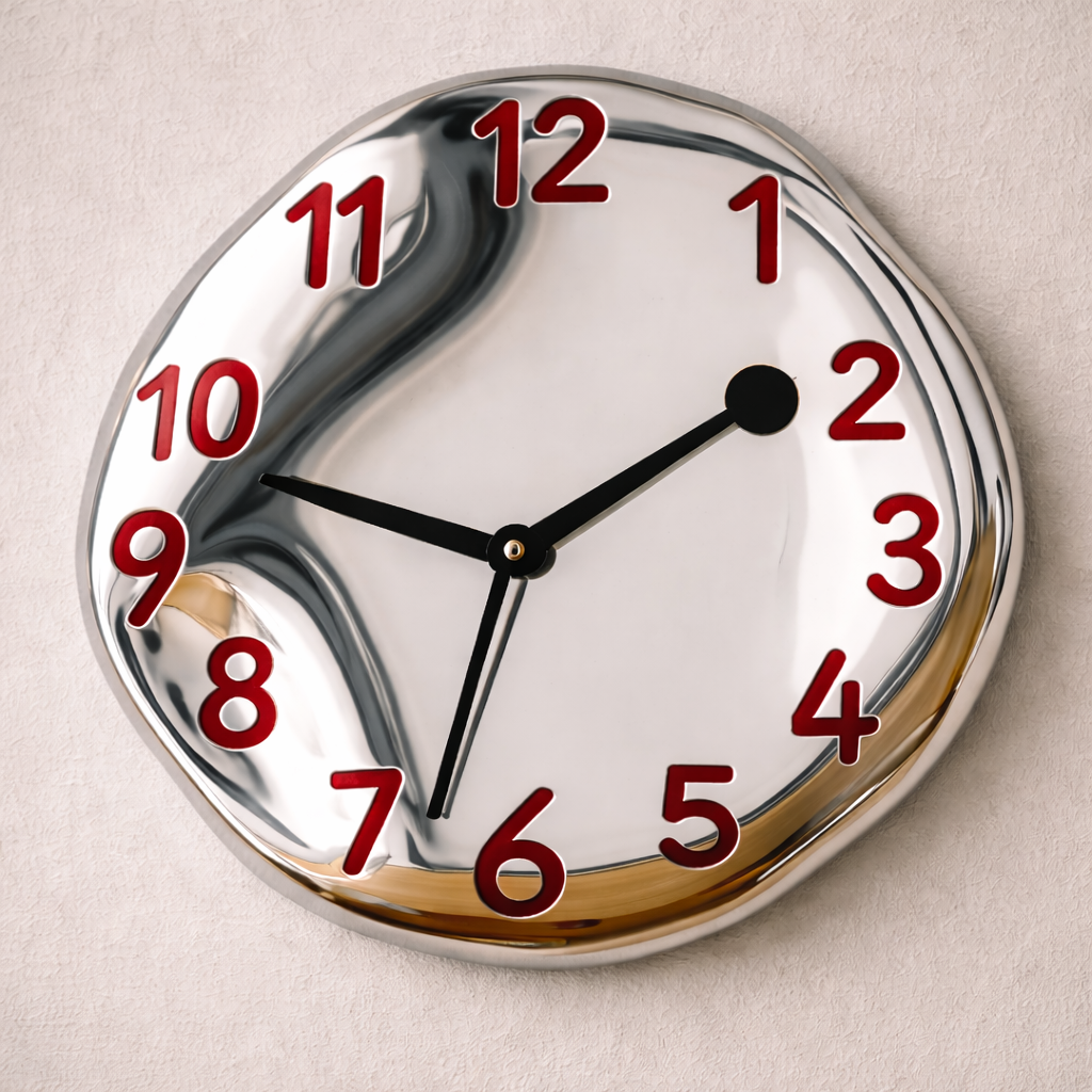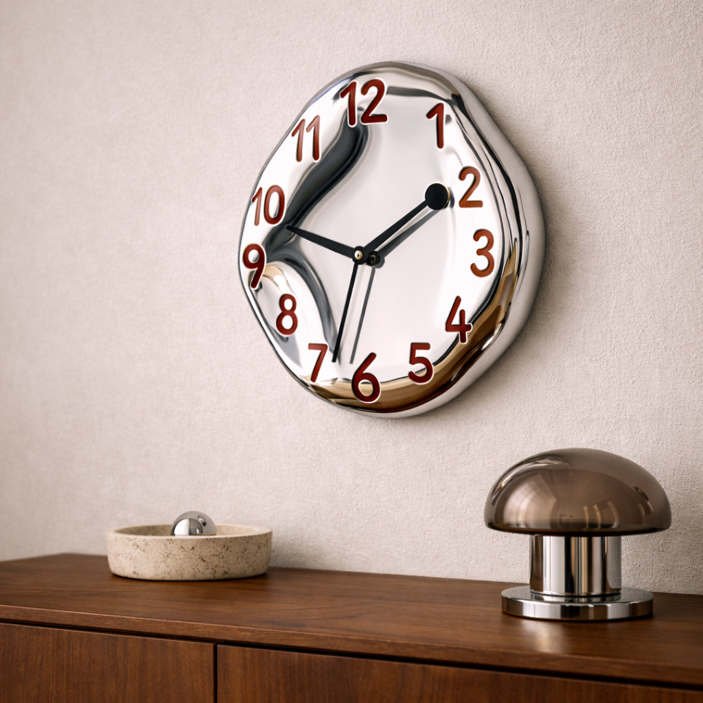 Son cadran volontairement déformé et sa finition chromée créent un effet visuel dynamique, presque cinétique.