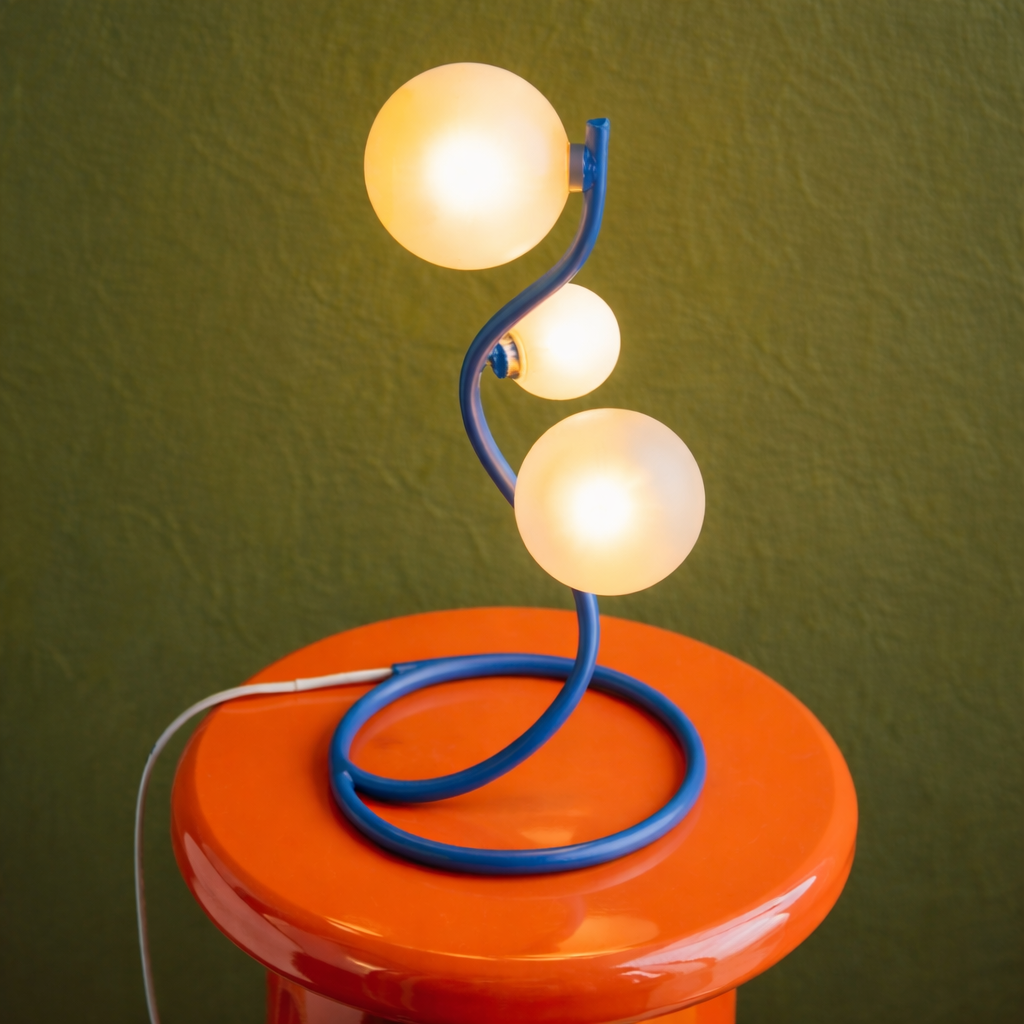 Sa structure ondulée bleu intense et ses globes lumineux créent un jeu visuel audacieux, entre design artistique et esprit pop.