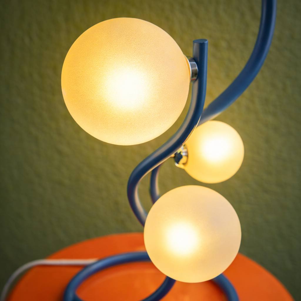 Lampe à poser au design sculptural composée d’une tige sinueuse en métal laqué bleu et de trois globes lumineux en verre opalin.