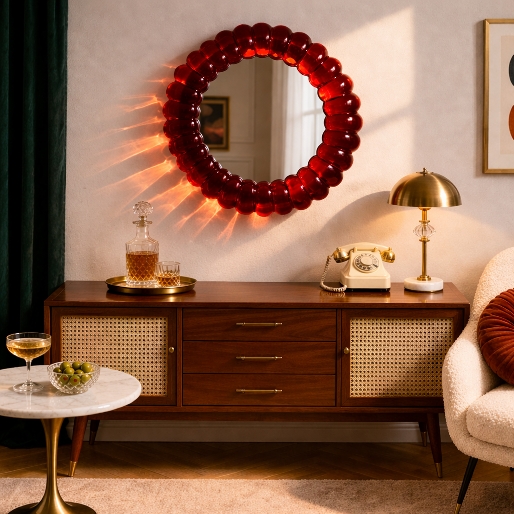Miroir rond design avec cadre rouge translucide sculptural aux volumes arrondis. Une pièce inspirée des années 70, parfaite pour un intérieur rétro chic vibrant.