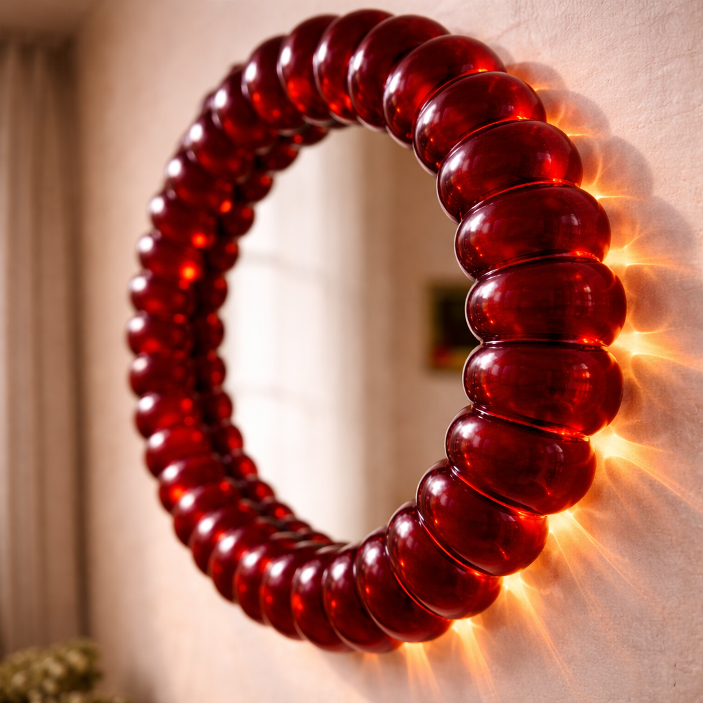 Miroir rond avec cadre sculptural en résine rouge translucide composé de modules bombés.