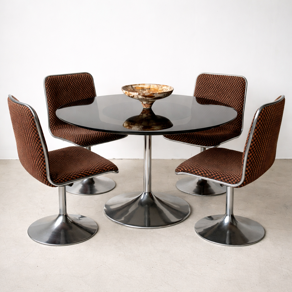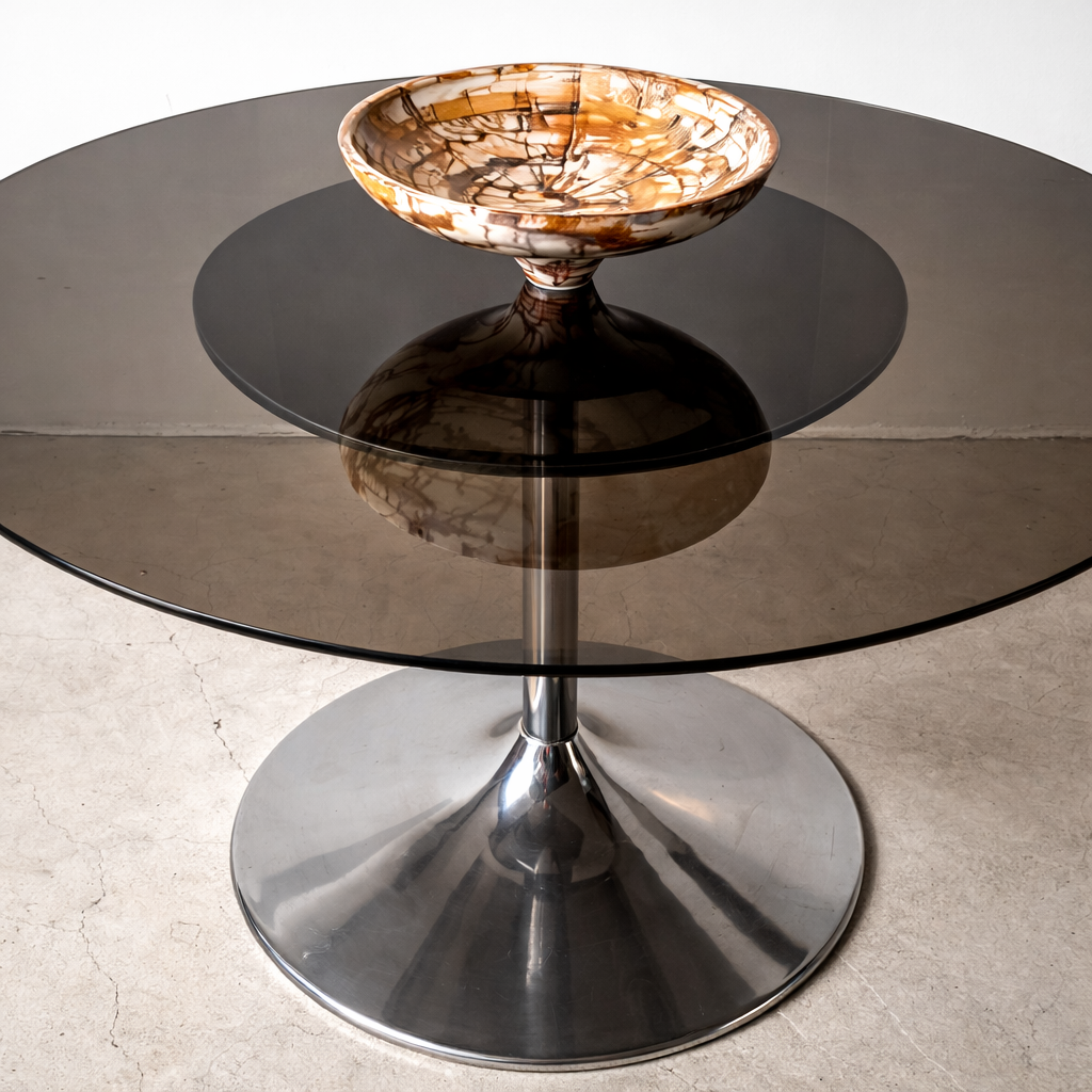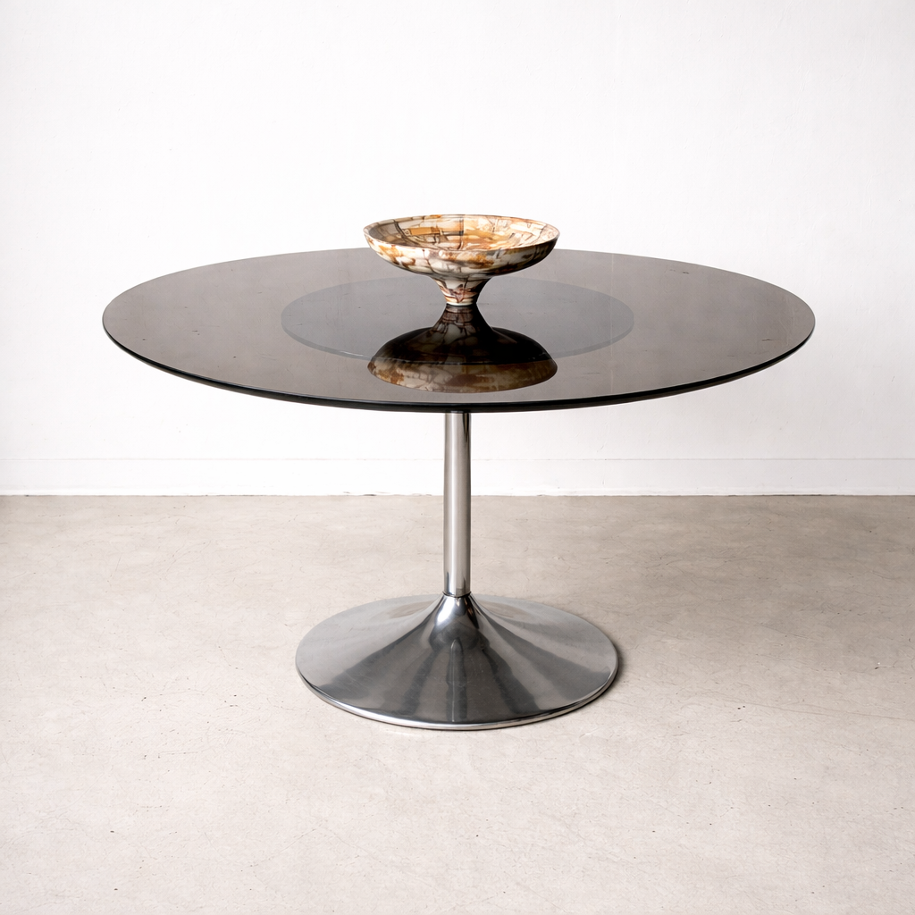 Table ronde avec plateau en verre fumé et pied central tulipe en métal chromé poli.