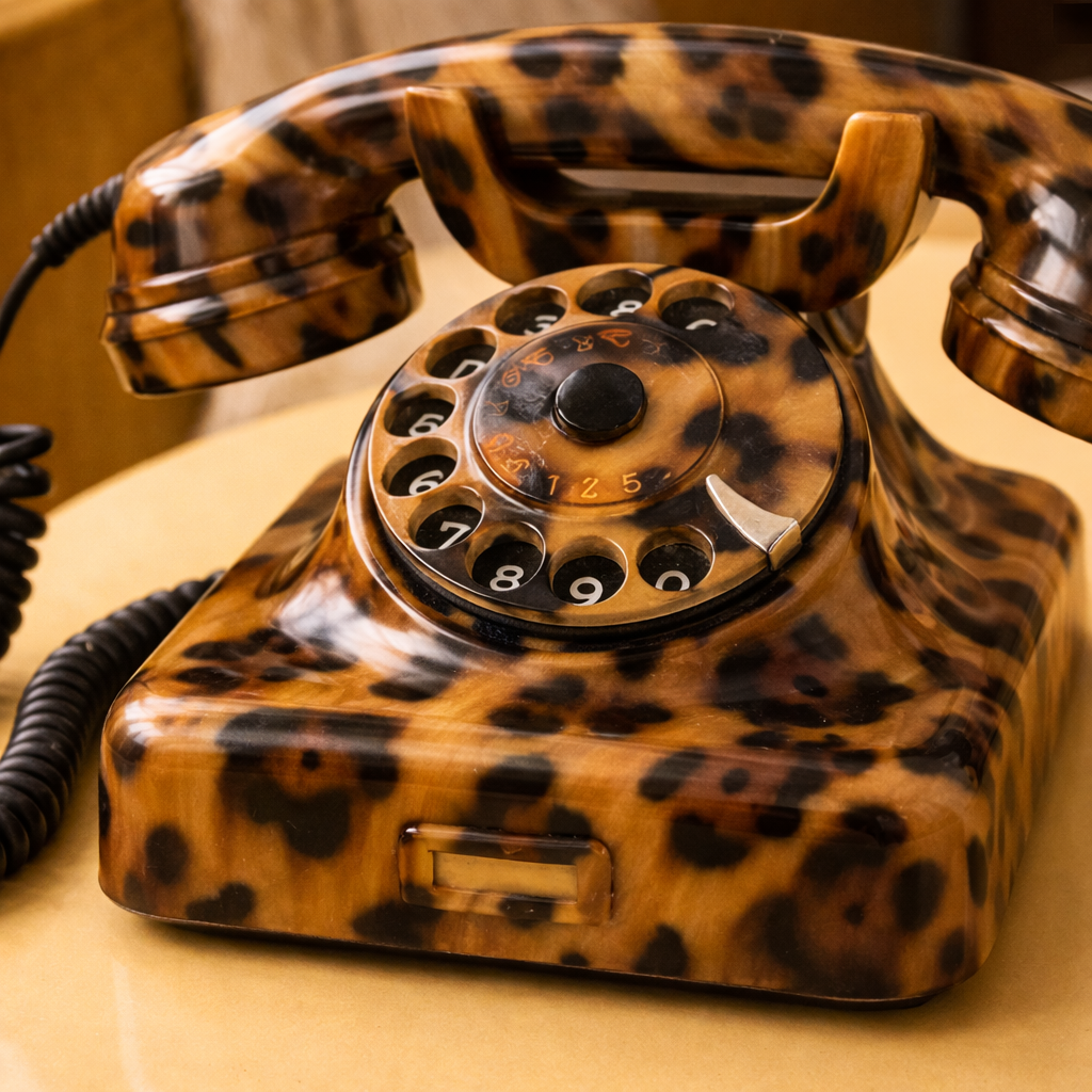Téléphone fixe à cadran rotatif avec finition effet écaille léopard brillante.